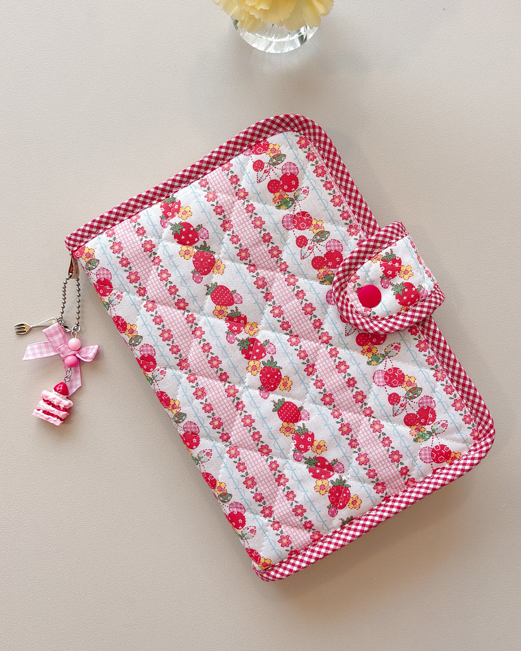 The Berry Very Book Cover is a soft, quilted fabric cover featuring a delightful strawberry pattern with a charming vintage vibe. It’s the perfect mix of cozy and cute—designed to bring a little bit of sunshine and a whole lot of sweetness to your daily reading and writing moments.