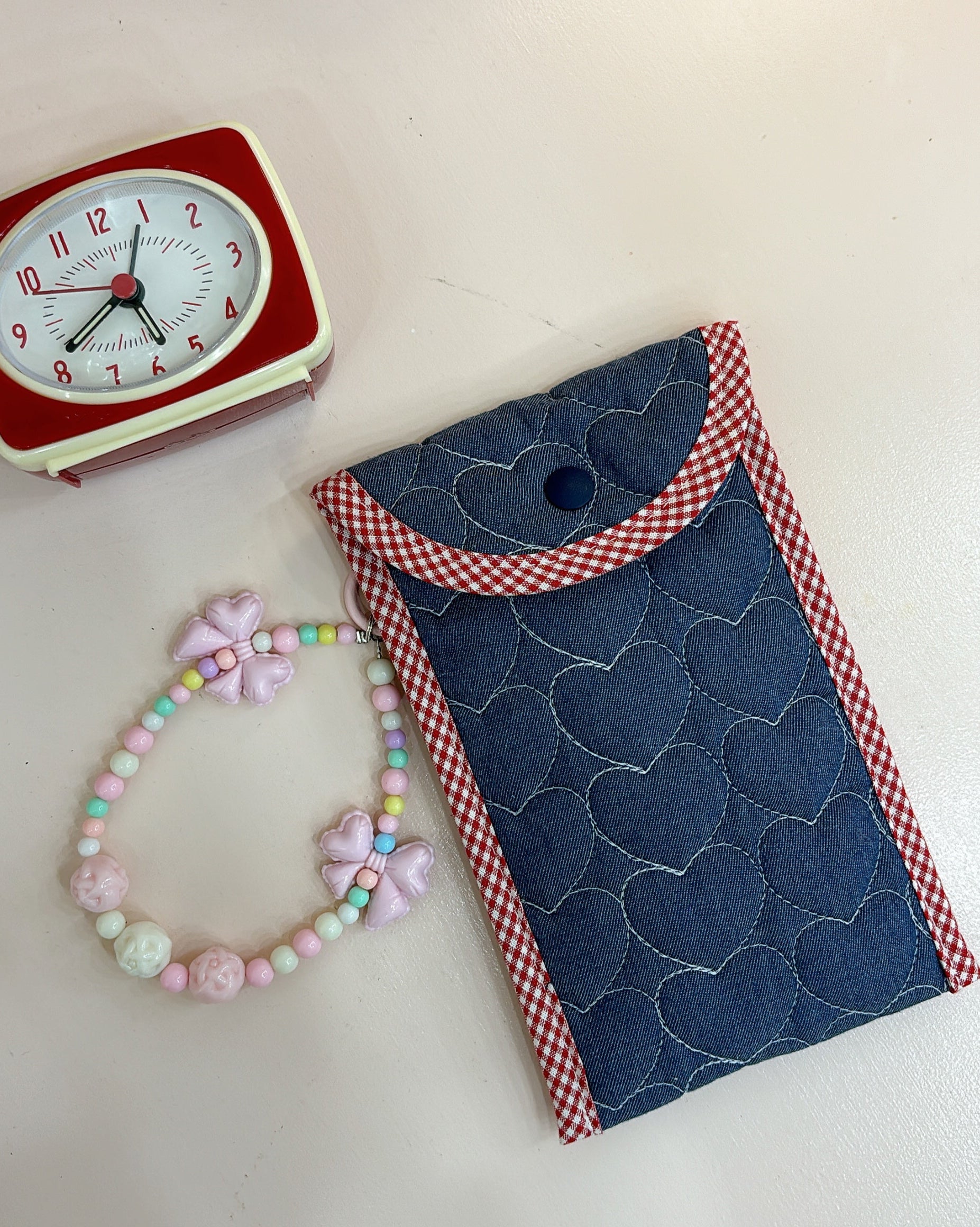 The New Jeans Pen Pouch is made from deep indigo denim, quilted with bold heart patterns that bring all the Y2K vibes. Lightly padded, lightweight, and spacious enough to hold more than just pens—this pouch is a little denim statement piece for your daily essentials.