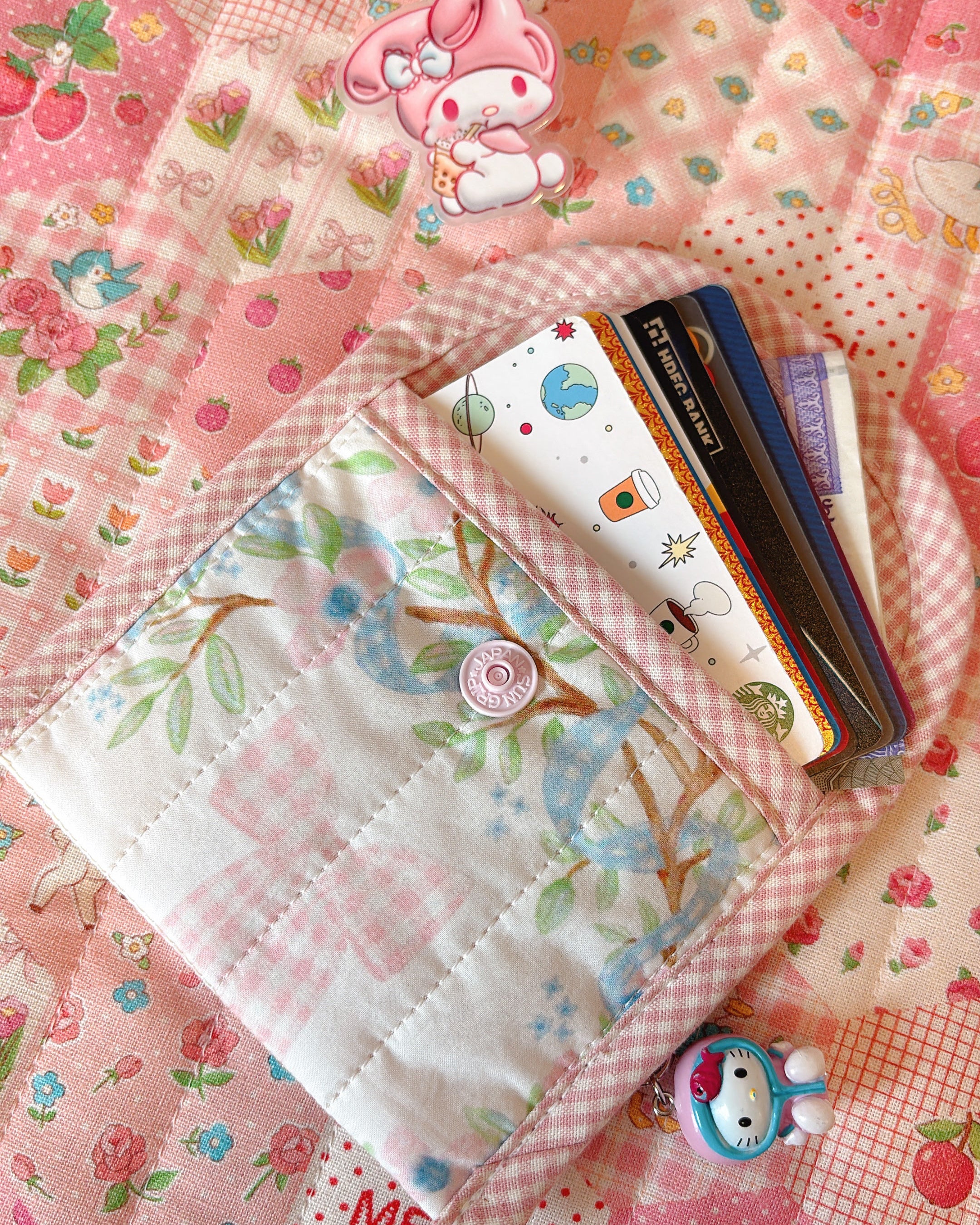 The Sweet Ribbon Card Pouch is crafted from delicate quilted cotton in soft pastel hues, adorned with charming ribbon patterns that bring to mind the sweetness of cotton candy. It’s the perfect size for cards, coins, AirPods, or small treasures—ready to add a sprinkle of cuteness to your day.
